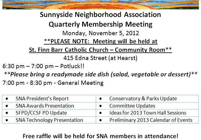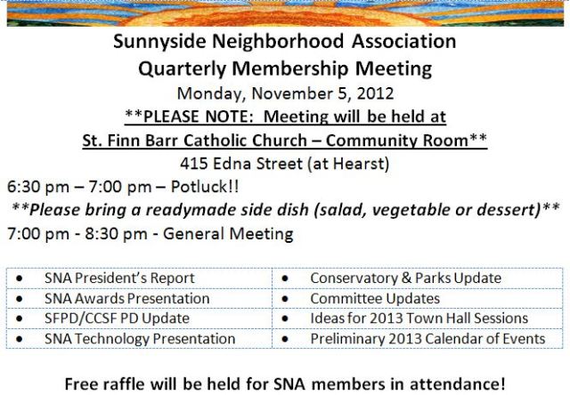SNA Quarterly Meeting & Holiday Potluck – Monday November 5 – St. Finn Barr Community Room On October 30, 2012 By Sunnyside Neighborhood AssociationIn Uncategorized SNA’s quarterly meeting is being held this coming Monday, November 5 at 6:30 p.m. Meeting is a holiday potluck and will be held at St. Finn Barr Catholic Church – Community Room – 415 Edna Street (at Hearst) **Please bring a readymade side dish (salad, vegetable or dessert)** Share this: Share on Facebook (Opens in new window) Facebook Share on Threads (Opens in new window) Threads Share on Mastodon (Opens in new window) Mastodon Share on Bluesky (Opens in new window) Bluesky Like Loading... Related