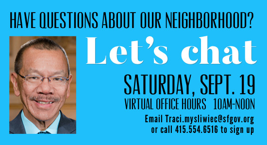 President Yee is holding virtual office hours on Sat Sept 19th, 10 AM – noon. To participate, email Traci.Mysliwiec@sfgov.org.
