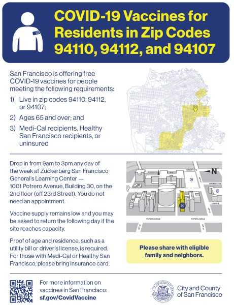 It is critical that older adults living in neighborhoods most impacted by the pandemic have early access to COVID-19 vaccinations to lower both the infection and death rates among a population disproportionally impacted by the virus. Vaccine supply remains low and you may be asked to return the following day if the site reaches capacity. More at https://sfhealthnetwork.org/covid-19-vaccine/