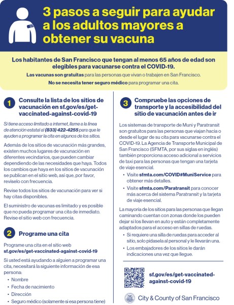 San Franciscans ages 65 and older are eligible to get the COVID-19 vaccine. Vaccines are free to people who live or work in San Francisco. You do not need insurance to book an appointment.