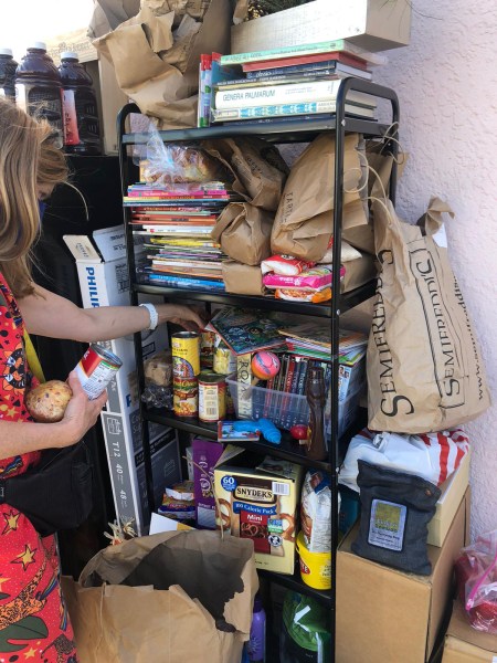 Sunnysider Perla Villa has started a small food pantry at the corner of Flood and Detroit–along with items like books for children–to help anyone in need. Perla does food rescue as her job but often has leftovers that she shares with neighbors.