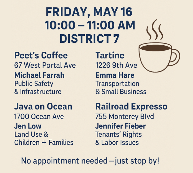 Supervisor Melgar’s legislative aides will be hosting drop-in coffee hours tomorrow Morning, May 16, at 10 AM at four local coffee shops. All residents interested in District 7 issues are welcome to attend. Each meeting has a specific focus: