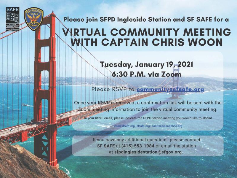 Captain Jones and SF SAFE welcome you to SFPD Ingleside’s Virtual Community Meeting on Tuesday April 20th 2021, at 6:30 PM. Email the name of the station “Ingleside Station” to community@sfsafe.org or text 415-379-0494 to have the registration info sent to you.