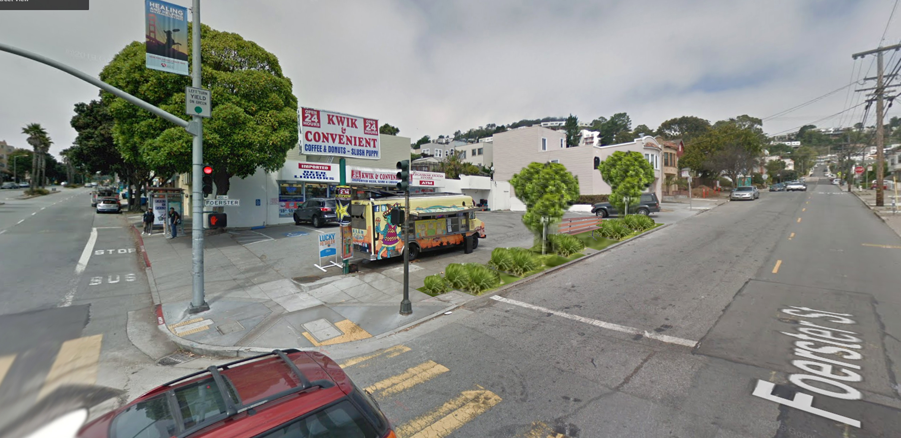 Kwiky Gardens: Two trees in 60′ strip along Foerster Street at intersection of Monterey Blvd, on the corner of Kwik and Convenient, 600 Monterey. There is no parking allowed on Foerster, so no need for ‘courtesy strips’ for those exiting parked cars. Friends of the Urban Forest estimates that the space could only have two trees, given code restrictions.